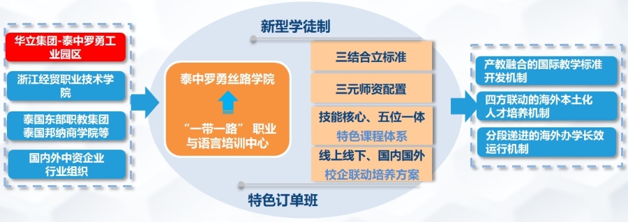学校秉持服务“走出去”企业的宗旨意识,密切关注产教协同体系的构建和合作机制建设,主动服务“走出去”企业发展,把产教融合贯穿至“本土化”人才培养全过程,通过泰中“四方联动”,打造了“三结合”的新型学徒制人才培养标准和师资供给模式,实现了“双轨人才培养、双岗师资配备、双向文化认同、双重能力培育”。具体做法如下:企业在国内设立“实训实习基地”与在海外设立“厂中校”结合起来,实现同一生产线上操作流程与标准统一;为“走出去”企业培养国内人才与培养“本土化”人才结合起来,实现双地区互动交流;将学历教育和职业资格证书培训结合起来,促进“一带一路”沿线职业技术标准互联互通。同时,针对不同培养对象和教学阶段,实施“院校教师+企业技术人员”“国内教师+本土教师”“本土教师+企业技术人员”的三元师资供给模式,有效解决了丝路学院教学如何“可持续”、模式如何“成体系”问题。
