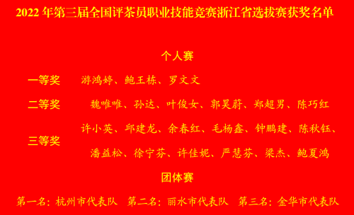 参加本次调饮师选拔赛的共35人,23家单位;参加评茶员选拔赛的共67人,50余家单位,汇集了全省最优秀的一批茶行业技能人才。经过3天的激烈角逐,两项选拔赛分别角逐出一等奖3名、二等奖6名,三等奖12名;其中,杭州、丽水、金华代表队分列评茶员选拔赛团体赛前三名。两项选拔赛的前3名选手以及评茶员选拔赛的冠军队伍将代表我省参加全国调饮师、评茶员职业技能竞赛。此外,浙茶集团等9家单位获评优秀组织奖。