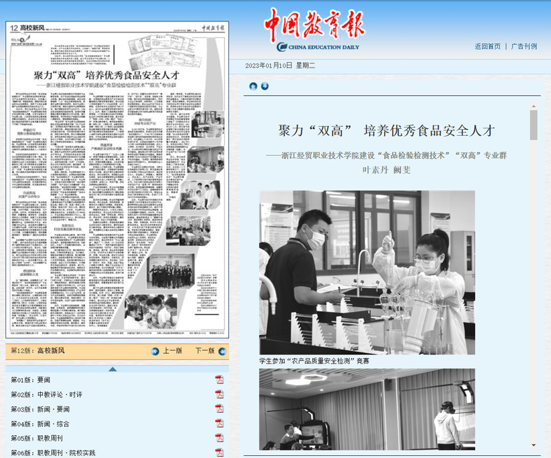 2021年,基于良好的合作基础,专业群与杭州市钱塘区市场监督管理部门续签了《共建食品安全服务平台合作协议》。2021年6月11日,浙江省市场监管部门联合钱塘区在学校成功举办食品安全宣传周暨“你点我检进校园”现场活动仪式,学校被授牌为“浙江省食安风险预警交流基地”。2022年9月,学校成功承办了浙江省首届食品检验检测行业技能竞赛(决赛),在行业里产生了巨大的影响。