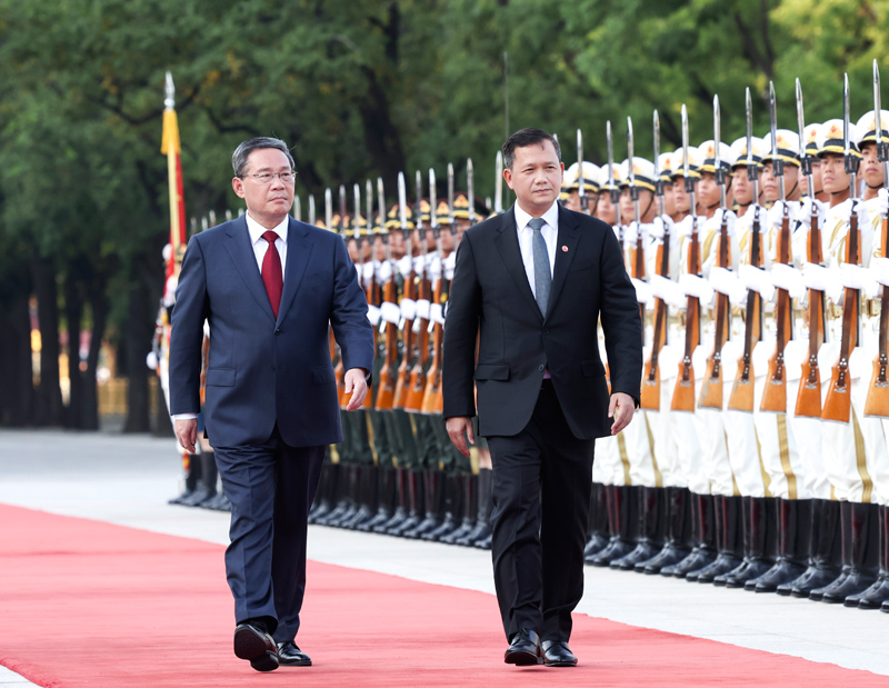 9月15日下午,国务院总理李强在北京人民大会堂同来华进行正式访问的柬埔寨首相洪玛奈举行会谈。这是会谈前,李强在人民大会堂东门外广场为洪玛奈举行欢迎仪式。新华社记者 庞兴雷 摄